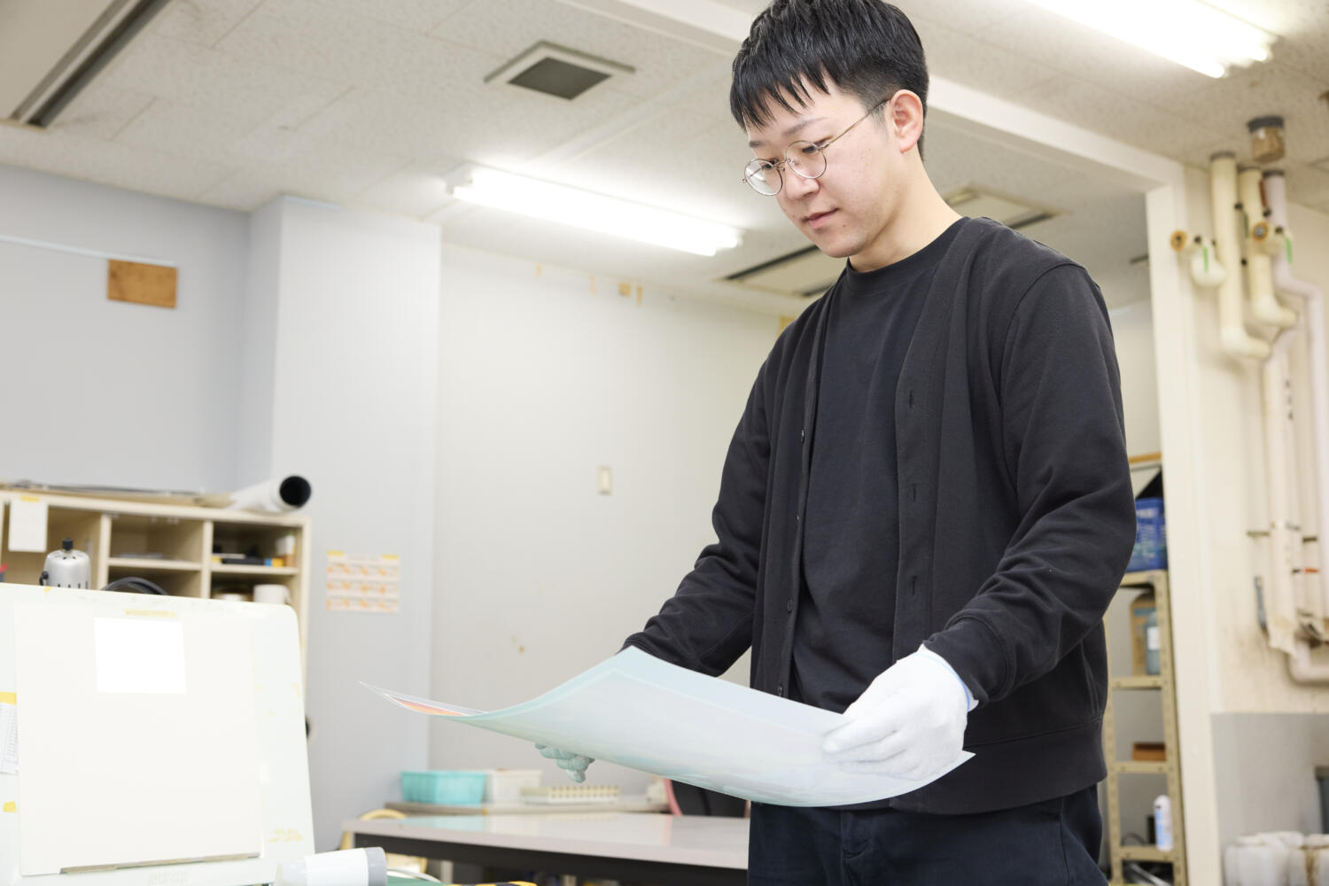 大型プリントの作業をしており、大型機械を使って、お客様のプリントを大きく伸ばすという作業をしています。