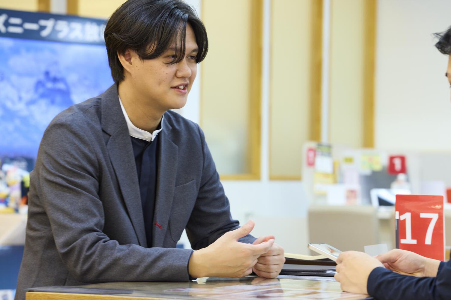 以前は別の仕事をしていたんですが、その仕事を辞めまして、次に何をしようかなっていうのを考えていた時に、ドコモショップ3店舗運営してますが、南店というお店に、当時は「カフェ・ルッカ」というカフェが併設されてまして。そこのカフェに僕の幼馴染が店長として働いていて、そのカフェで求人情報誌を見て、転職活動をしてたのをきっかけに、うちの総務の鷲澤さんがその幼馴染を通して、「よかったらうちに来ないか」という声をかけていただいたっていうのが入社のきっかけになります。